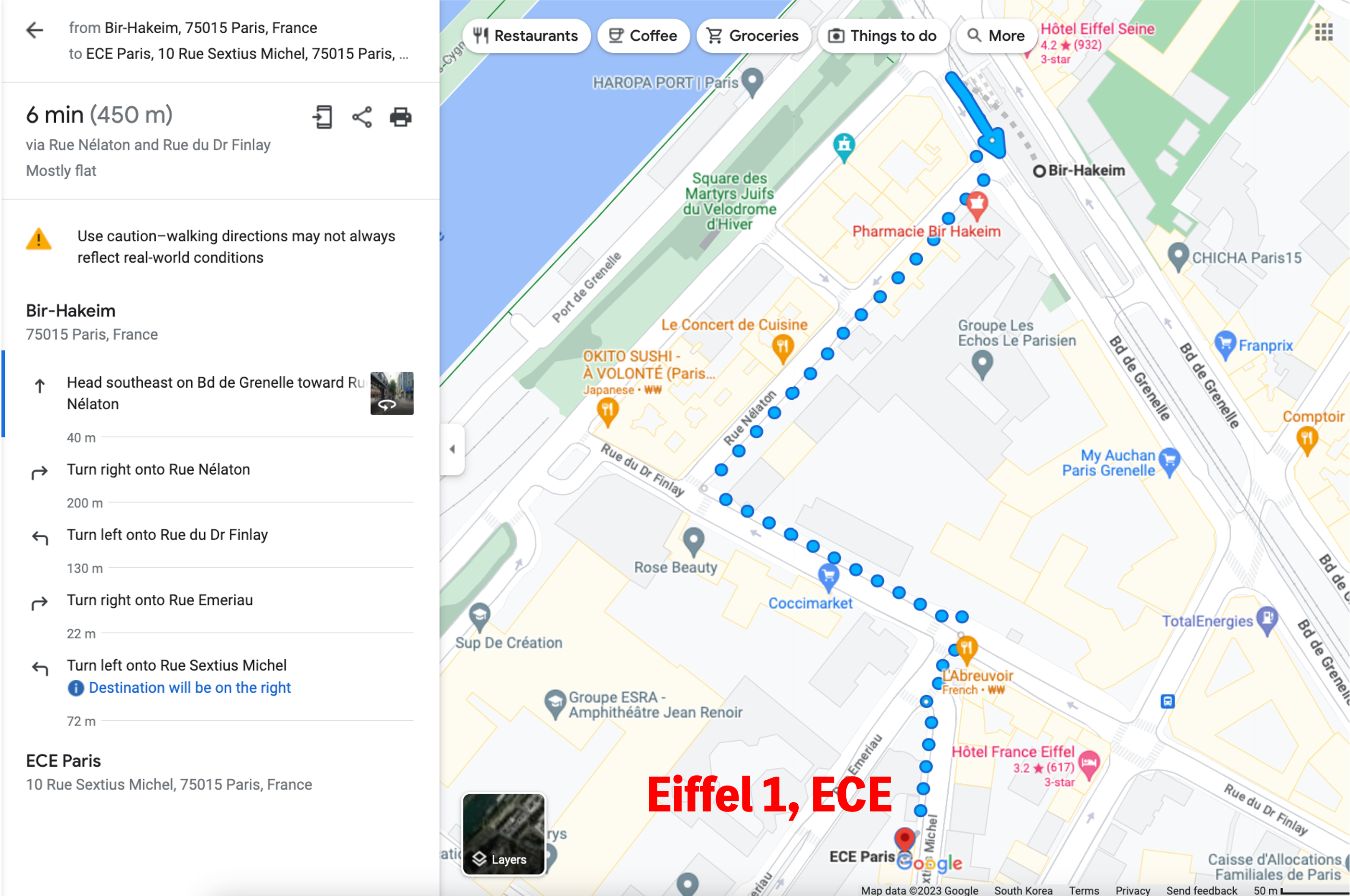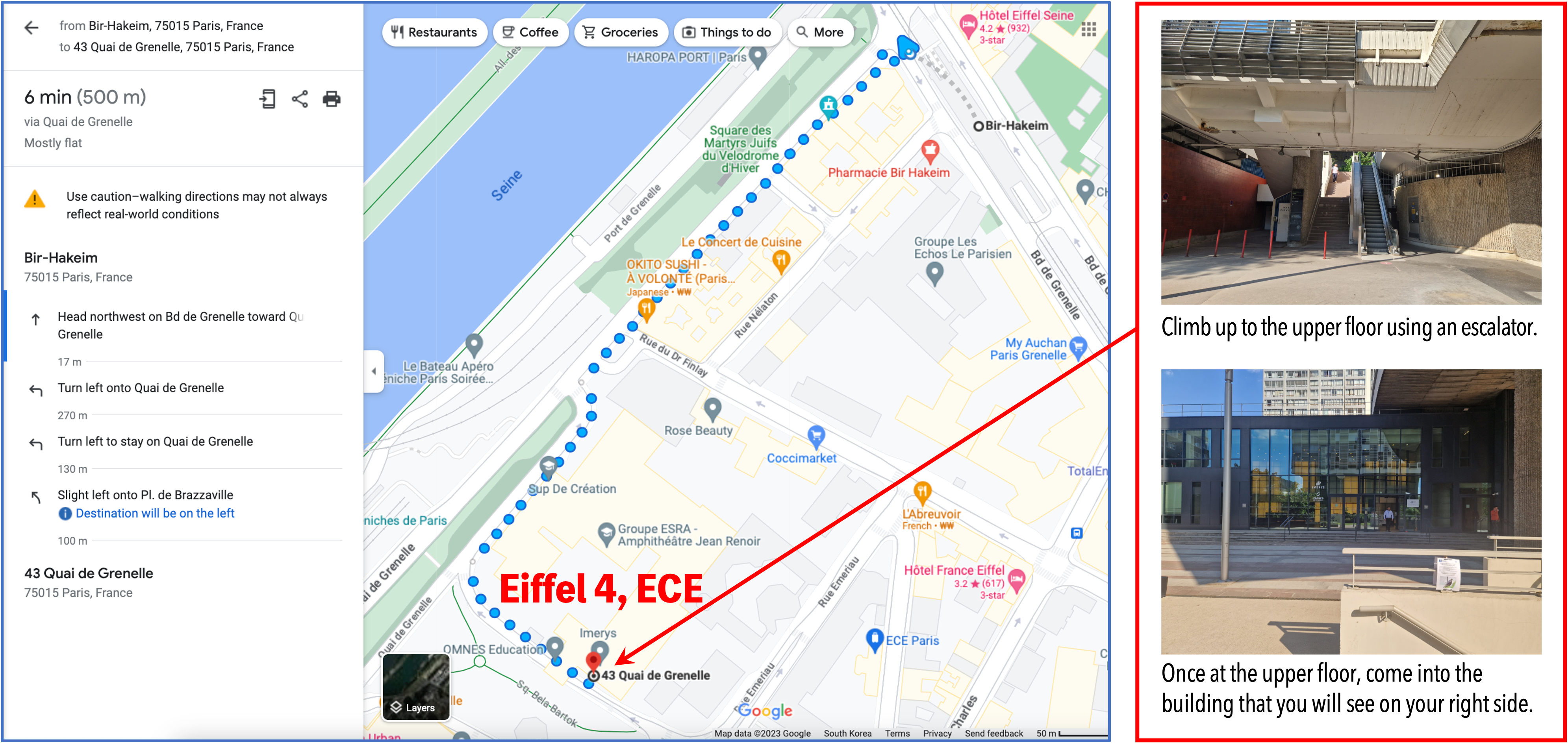 Bir-Hakeim (Metro 6 station) ↔ Eiffel 4/Imerys– Eiffel 4, ECE: 43 quai de Grenelle, 75015 Paris (Room S1 and Lunch place)